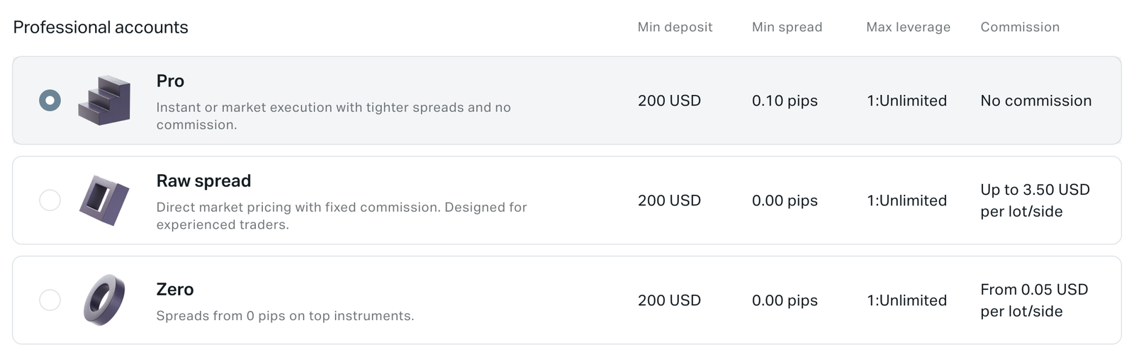 | 特色 | 專業帳戶 | 原始擴散帳戶 | 零帳戶 |